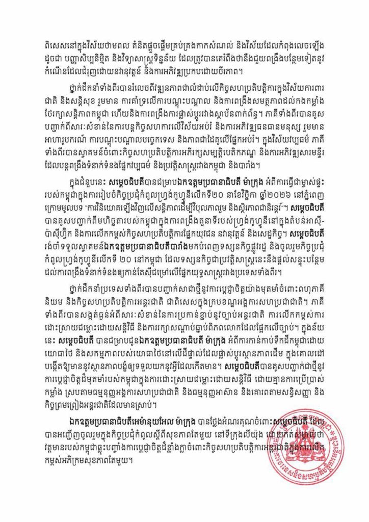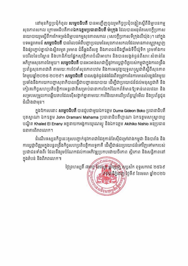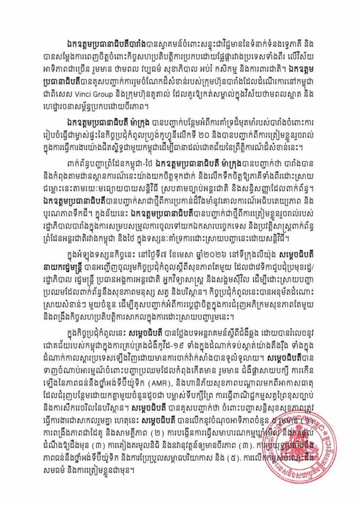 ភ្នំពេញ៖ នៅថ្ងៃទី០៩ ខែមេសា ឆ្នាំ២០២៦នេះ ក្រសួងការបរទេស បានចេញសេចក្ដីប្រកាសព័ត៌មាន ស្ដីពី លទ្ធផលនៃទស្សនកិច្ចការងាររបស់សម្ដេចធិបតីនាយករដ្ឋមន្រ្ដី នៅសាធារណរដ្ឋបារាំង ចាប់ពីថ្ងៃទី០៦ ដល់ថ្ងៃទី០៩ ខែមេសា ឆ្នាំ២០២៦។